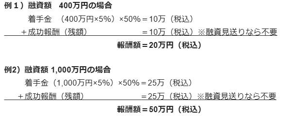 | 融資が見送りとなった場合 | 着手金の返金はありません。 (追加の成功報酬も発生しません) |